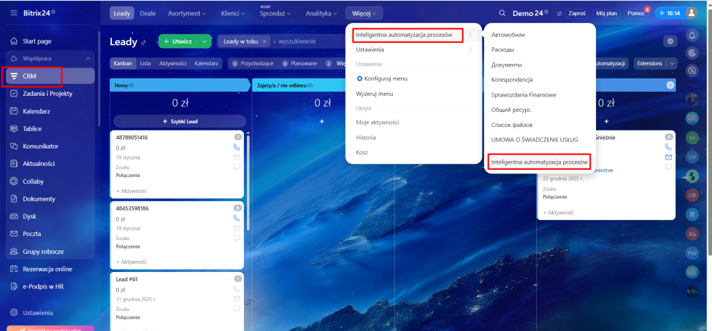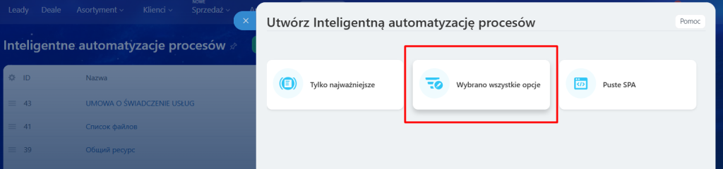 CRM → Więcej → Inteligentną automatyzację procesów → Utwórz → Wybrano Wszystkie opcje.