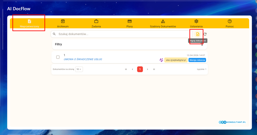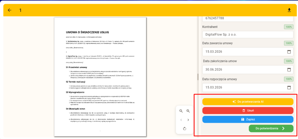 W tej części instrukcji pokażemy, jak w praktyce korzystać z aplikacji AI DocFlow do przetwarzania dokumentów — krok po kroku, na rzeczywistych przykładach.