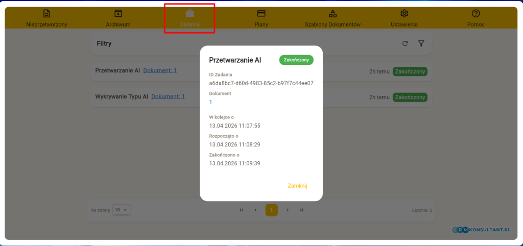 W zakładce „Zadania” można śledzić przetwarzanie.
