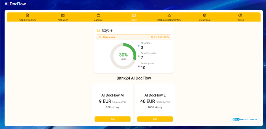 Dostępny jest okres próbny — 10 stron za darmo, aktywowany automatycznie po instalacji.