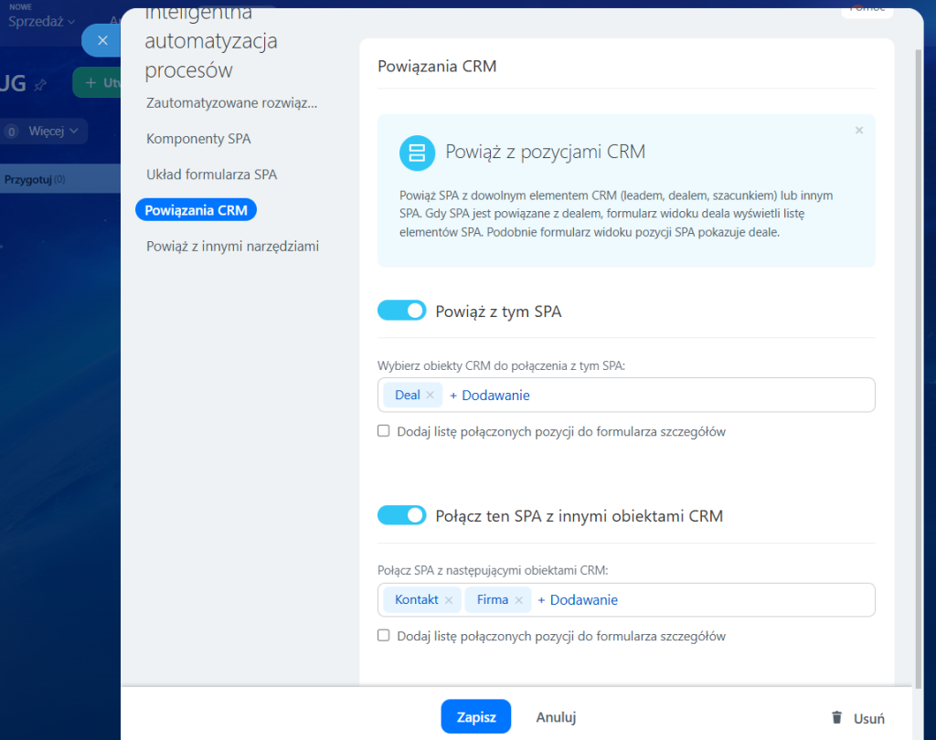 „Powiąż z tym SPA„, „Połącz ten SPA z innymi obiektami CRM”