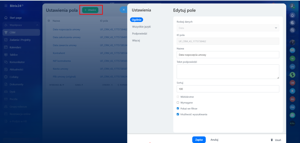 - w kolumnie „Pole Bitrix” wybierz pole SPA, które odpowiadają tworzonemu polu.