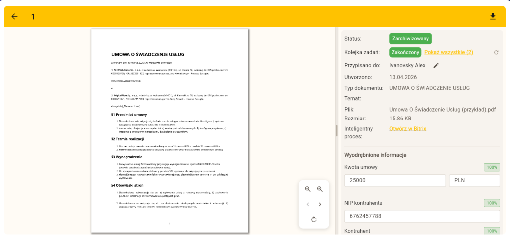 Na portalu Bitrix24 należy utworzyć Inteligentną automatyzację procesów dla każdego typu dokumentów (np. Paszport, Faktura, Umowa itp.).